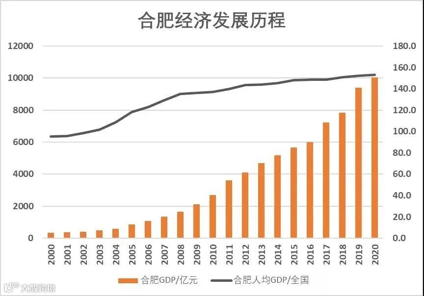 2000年,合肥的人均GDP低于全国平均水平。2020年,合肥的总量超过万亿之后,人均GDP已经是全国平均水平的1.6倍,合肥20年经历了一个极快速的增长。