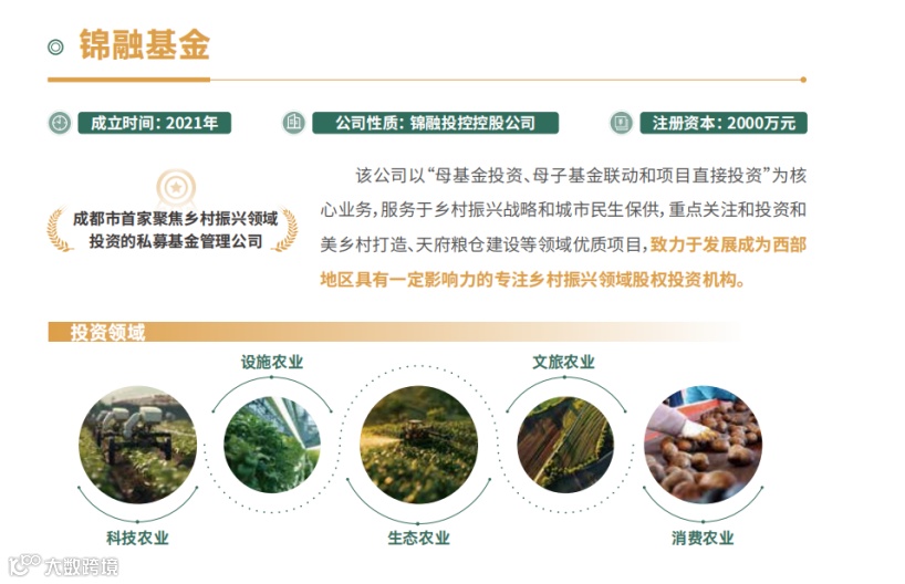基金介绍:锦融基金成立于2021年。基金管理公司锦融投控控股公司系成都市首家聚焦乡村振兴领域投资的私募基金管理公司。公司以“母基金投资、母子基金联动和项目直接投资”为核心业务,服务于乡村振兴战略和城市民生保供,重点关注和投资和美乡村打造、天府粮仓建设等领域优质项目,致力于发展成为西部地区具有一定影响力的专注乡村振兴领域股权投资机构。
