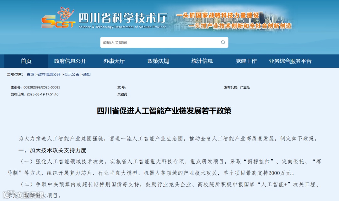 2025年,更是四川人工智能产业的“开花”时期。3月19日,四川省科技厅、发改委发布《四川省促进人工智能产业链发展若干政策》,要求加大技术攻关支持力度、大力支持人工智能产业发展、加快推动人工智能终端应用和场景培育、强化算力和数据供给能力、着力构建要素保障体系5个部分。并提出计划3年投入12个亿,全力打造“科技攻关更聚焦、场景开放更丰富、算力供给更普惠、产业生态更完善”的人工智能发展环境,为企业提供专业管用、高度匹配的政策工具包。