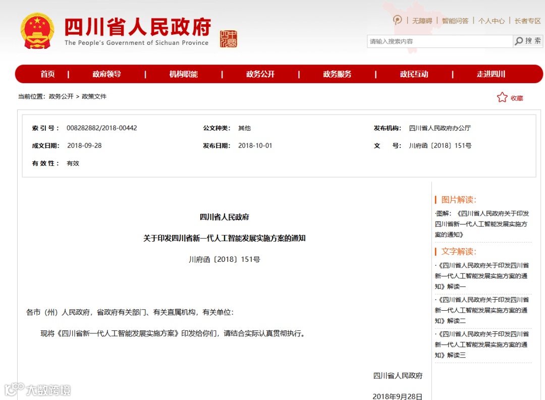 2018年7月26日,四川省成立人工智能联盟。同年9月,四川出台《四川省新一代人工智能发展实施方案》,要求加快推进新一代人工智能创新应用前瞻性布局,为全省大力发展数字经济、加快布局战略性新兴产业和未来产业提供支撑。并提出2025年,人工智能基础理论研究实现重大突破,部分技术与应用达到世界先进水平,人工智能新产业、新业态、新模式加速涌现,建成5个左右人工智能产业聚集区,培育30家左右人工智能创新标杆企业,形成人工智能核心产业规模超1000亿元,带动相关产业规模5000亿元以上,“人工智能+”成为带动我省产业升级和经济转型的新动力。2030年,人工智能总体发展水平进入国内领先行列,形成核心技术、关键系统、支撑平台、智能应用完备的产业链和高端产业群,建成中西部人工智能创新研发和产业化高地,人工智能产业成为引领四川经济社会快速发展的主导产业。