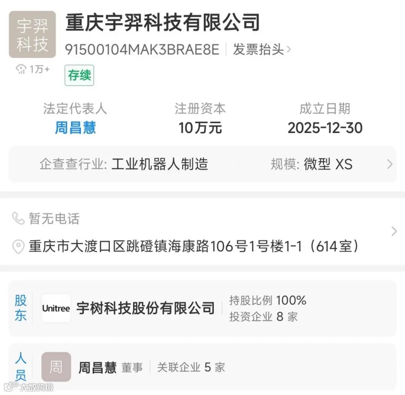 据天眼查信息,宇树科技股份有限公司(简称:宇树科技)全资子公司重庆宇羿科技有限公司(简称:重庆宇羿科技)于2025年12月30日注册成立。