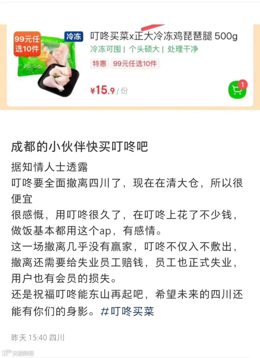 在仓皇撤离之下,距离叮咚买菜进入成都、重庆也不过两、三年。市场不景气,而叮咚买菜营收压力巨大,撤出川渝市场,无疑为“壮士断腕”之举。