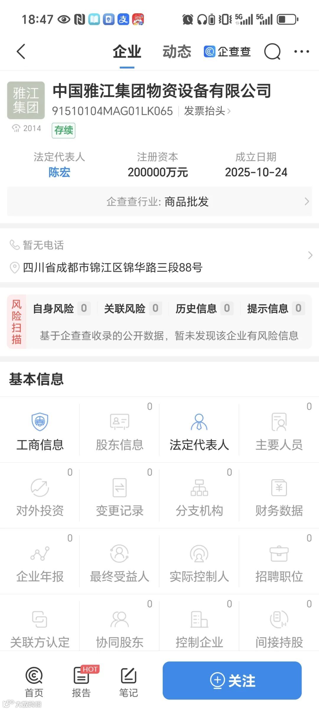 成渝招商助推中心最新消息:新央企雅江集团物资设备有限公司已于24日正式注册。3天内,雅江集团已经有3家公司正式注册落地成都。