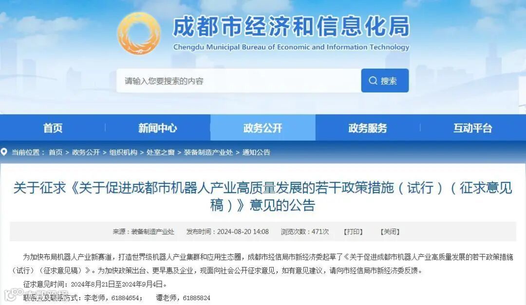 成都市经济和信息化局官方网站8月20日发布了《关于促进成都市机器人产业高质量发展的若干政策措施(试行)(征求意见稿)》,面向社会公开征求意见。《政策措施》总共14条,涉及多个方面。如果公众有意见建议,请于9月4日前填写意见反馈表。关于《政策措施》,成渝招商助推中心为大家梳理7大亮点。