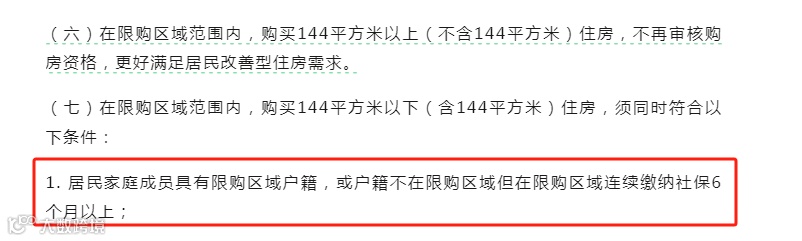 新政显示,限购区购房资格为,购买144平以下住房需要限购区户籍,或者在限购区缴纳社保满6个月,购买144平以上不需要购房资格。