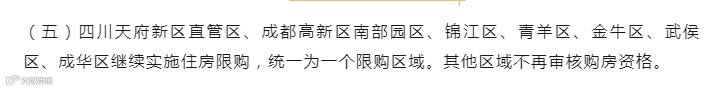 新政指出,四川天府新区直管区、成都高新区南部园区、锦江区、青羊区、金牛区、武侯区、成华区继续限购,但统一为一个限购区域,可交叉购买,其他区解除限购。