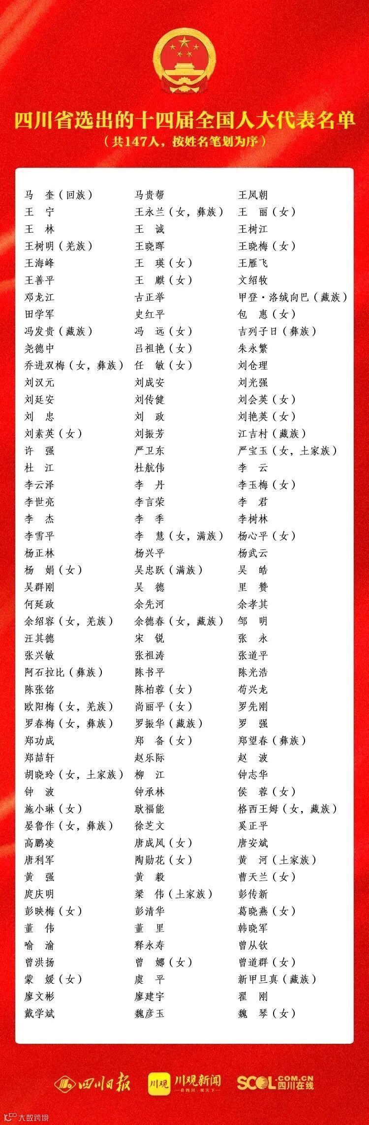 2023年1月15日,四川省十四届人大一次会议闭幕,选举产生了147名四川省第十四届全国人民代表大会代表,将依法报请全国人大常委会代表资格审查委员会审查。同时,选举产生了四川新一届地方国家机构领导名单。