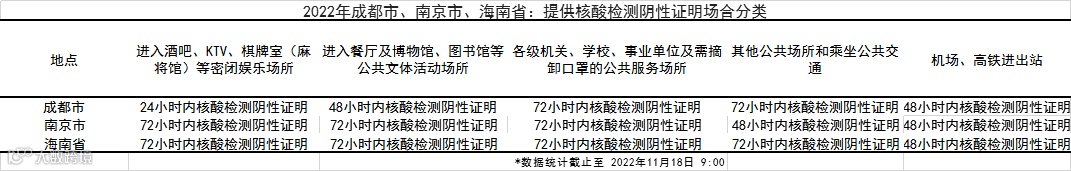 成都市政府表示,因综合考虑近期疫情形势,将继续坚持重点场所查验核酸检测阴性证明,其中进入酒吧、KTV、棋牌室(麻将馆)等密闭娱乐场所查验24小时内核酸阴性证明,进入餐厅及博物馆、图书馆等公共文体活动场所查验48小时内核酸阴性证明,进入党政机关、其他公共场所和乘坐公共交通查验72小时内核酸阴性证明。