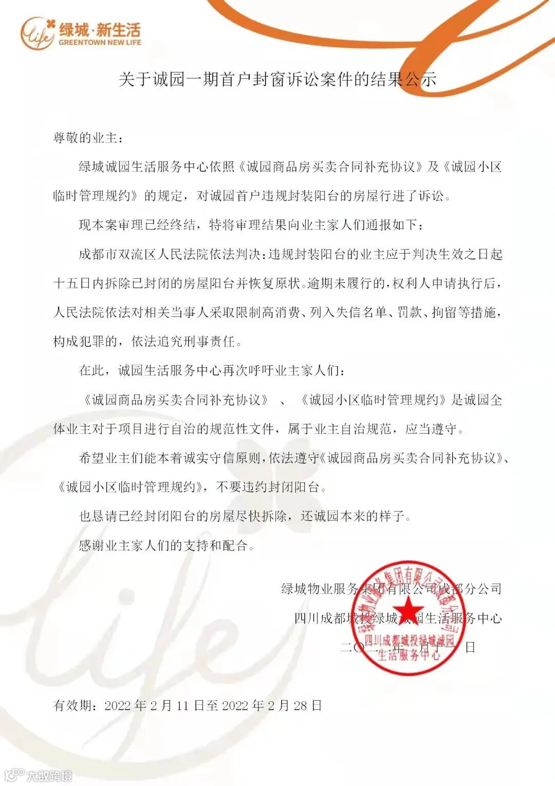 诚园一期首户封窗诉讼案一审结果公示,双流区法院判决,违规封装阳台的业主需在十五日之内拆除违规封闭的房屋阳台并恢复原貌,如不执行,违规封装阳台业主将被列入失信名单。