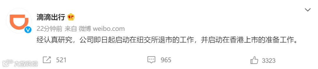 12月3日早间,据微博@滴滴出行消息称,经认真研究,公司即日起启动在纽交所退市的工作,并启动在香港上市的准备工作。