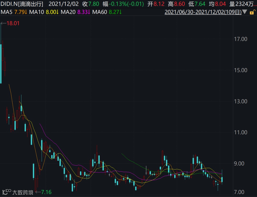 截至2日收盘,滴滴出行收跌0.13%,报7.8美元/股。