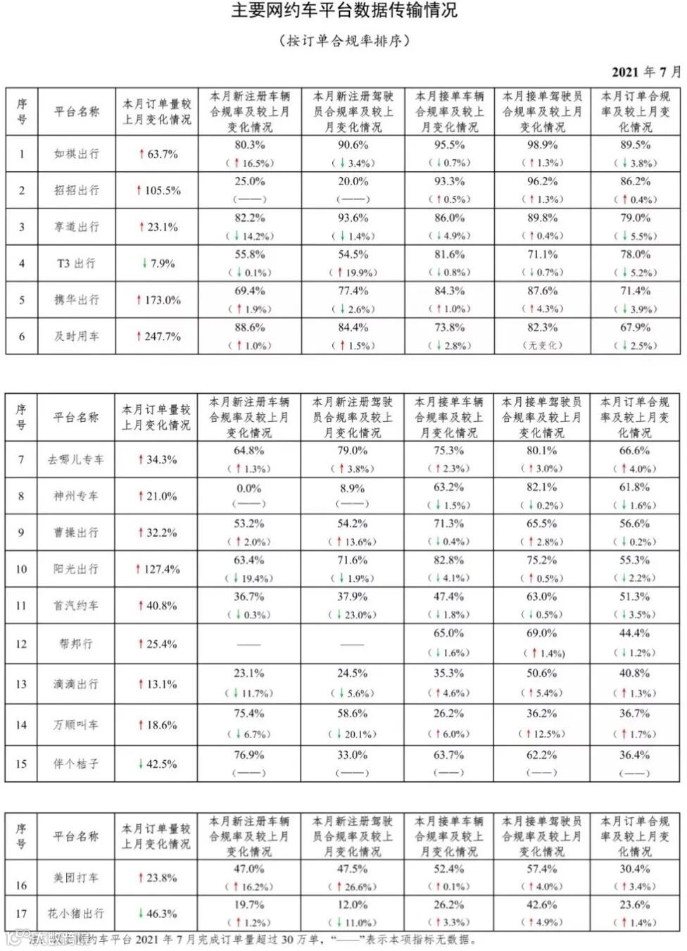 就在7月,交通运输部公布数据显示,国内订单量超过30万单(注:交通运输部每月以30万单为标准对主要网约车平台运行情况进行统计)的网约车平台共有17家。与6月份相比,新增携华出行、招招出行、伴个桔子、去哪儿专车、及时用车5家平台。