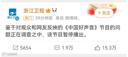 据浙江卫视官方微博消息,鉴于对观众和网友反映的《中国好声音》节目的问题正在调查之中,该节目暂停播出。