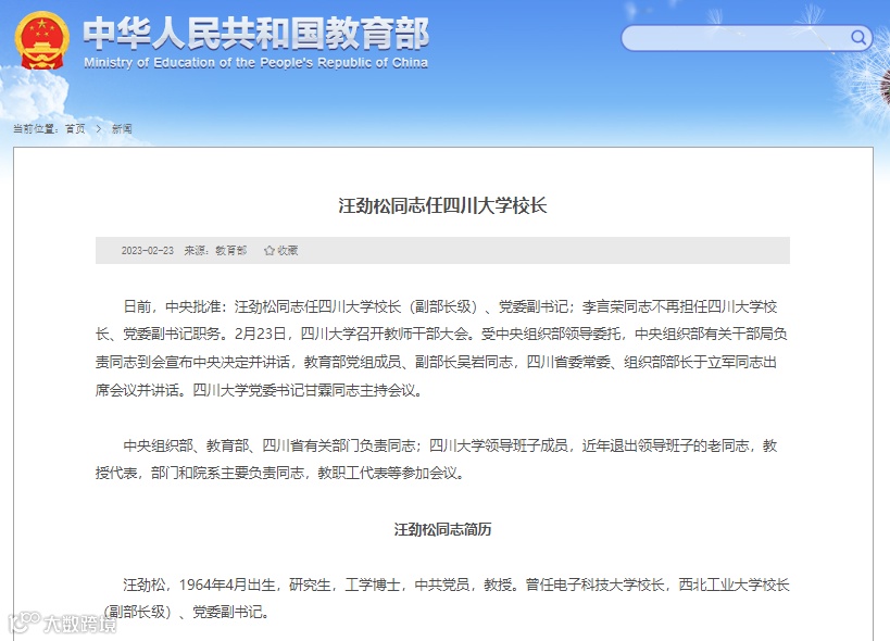日前,中央批准:汪劲松同志任四川大学校长(副部长级)、党委副书记;李言荣同志不再担任四川大学校长、党委副书记职务。