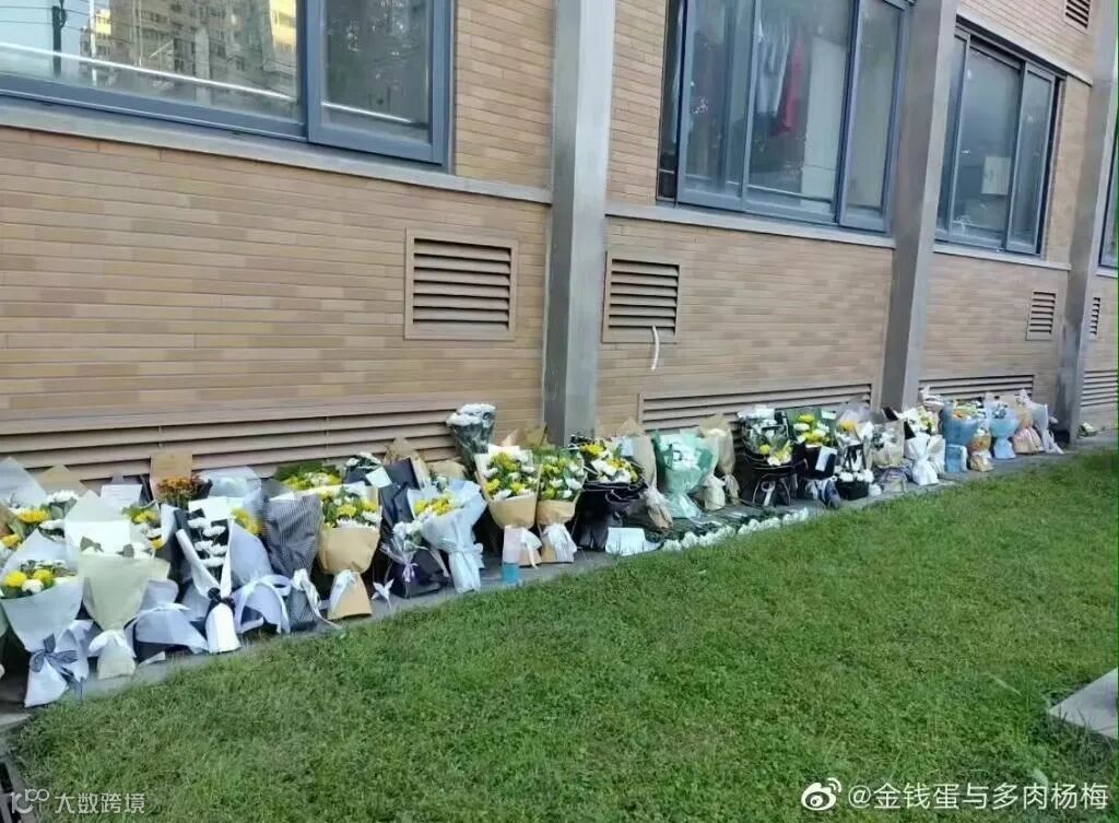 宿舍楼下摆满了同学们送别的鲜花。图据网友