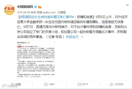 ▶圆通回应:悲痛和自责,积极配合后续调查