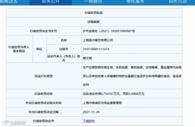 根据行政处罚决定书,2021年8月20日,上海市杨浦区市场监督管理局依法对上海昱亦餐饮有限公司经营的“牛蛙”食品进行了抽样检验。检验结果显示,该牛蛙食品的恩诺沙星(以恩诺沙星与环丙沙星之合计)项目不符合GB 31650-2019《食品安全国家标准食品中兽药最大残留限量》要求,检验结论为不合格。行政处罚决定书还显示,涉事食品的复检结果仍显示该项目不合格,该公司对复议结论无异议。