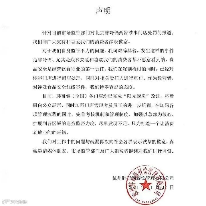 事后,胖哥俩针对被罚事件发布道歉声明,称对于公司自身监管不力的问题,难辞其咎。声明表示,食品安全是经营饮食行业的第一责任,胖哥俩在深刻检讨的同时,已经对涉事门店进行闭店处理,同时对相关责任人进行重罚。