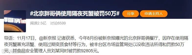 11月17日,北京市丰台区市场监管局官方微信公众号“丰台市场监管”公布第四批民生领域的“铁拳”典型案例,其中8月份被媒体曝光使用“隔夜死蟹”的北京胖哥俩餐厅,被丰台区市场监管局处以没收违法所得和罚款50万元,其食品安全管理人员刘某同时被罚款92805元。