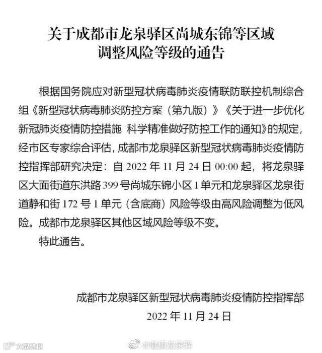 二、自2022年11月24日起,将万安街道东林春天14栋,籍田街道市场南街23号3栋2-3单元,华阳街道万科公园传奇2期小区5栋,华阳街道广都上街91号、93号、95号、97号、99号(楼栋),万安街道滨江和城二期10栋,华阳街道南湖国际社区6期南区34栋调整为低风险区。