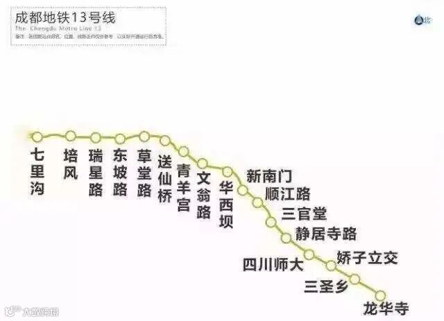 成都地铁13号线一期起于七里沟站,途径青羊区、武侯区、锦江区,止于龙华寺站,大致呈东西走向。现已相继完成老马堰站、七里沟站、瑞星路站、三官堂站、静居寺站、新南门站、文翁石室站、公园大道站等站点的一期土建施工打围,迅速开展场内绿化迁移和设施拆除等前期工作。