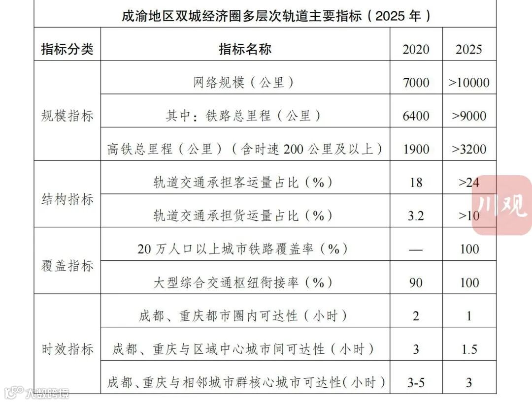 《规划》提出,到2025年成渝地区双城经济圈轨道交通总规模达到1万公里以上,其中铁路网规模达到9000公里以上、覆盖全部20万以上人口城市,形成重庆、成都都市圈1小时通勤圈,实现重庆、成都“双核”间 1 小时通达。