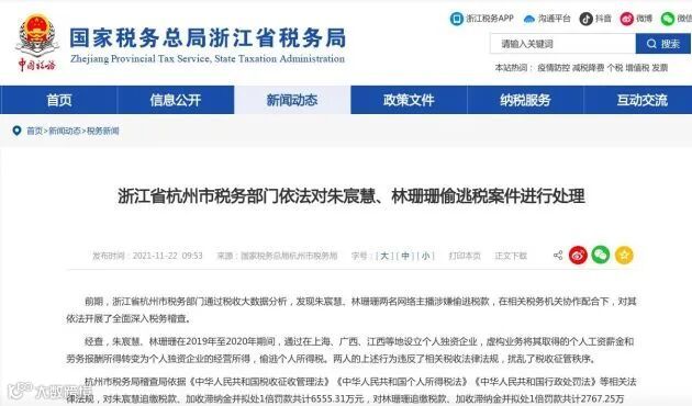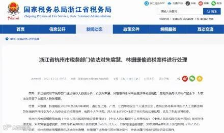 日前,杭州市税务局稽查局已依法向朱宸慧、林珊珊下达税务行政处理决定书,并依法履行税务行政处罚告知程序。