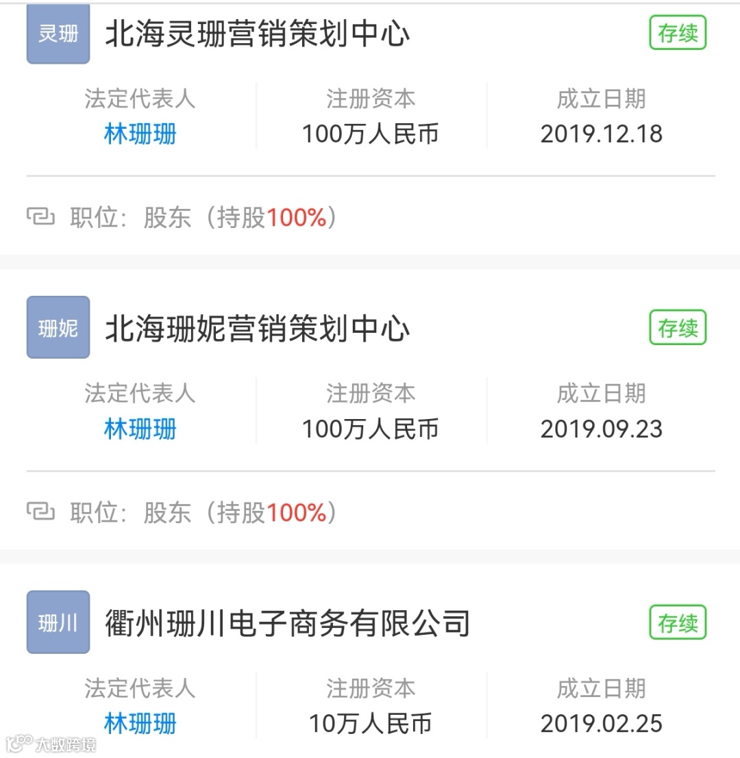 而林珊珊的关联公司有11家,其中7家为存续状态,5家成立于2019年至2020年期间。