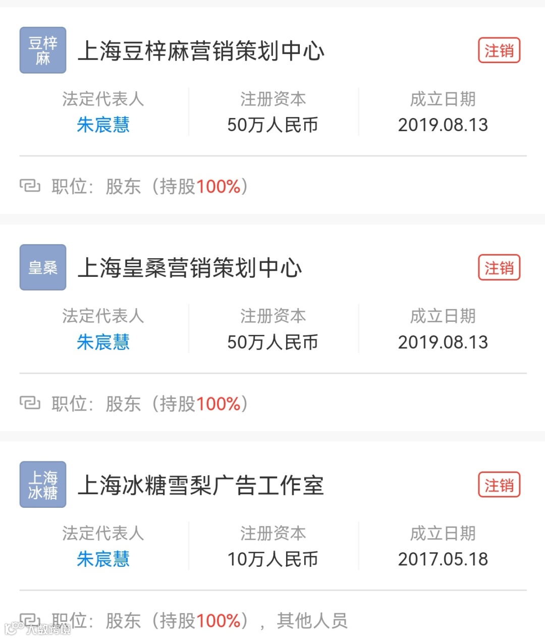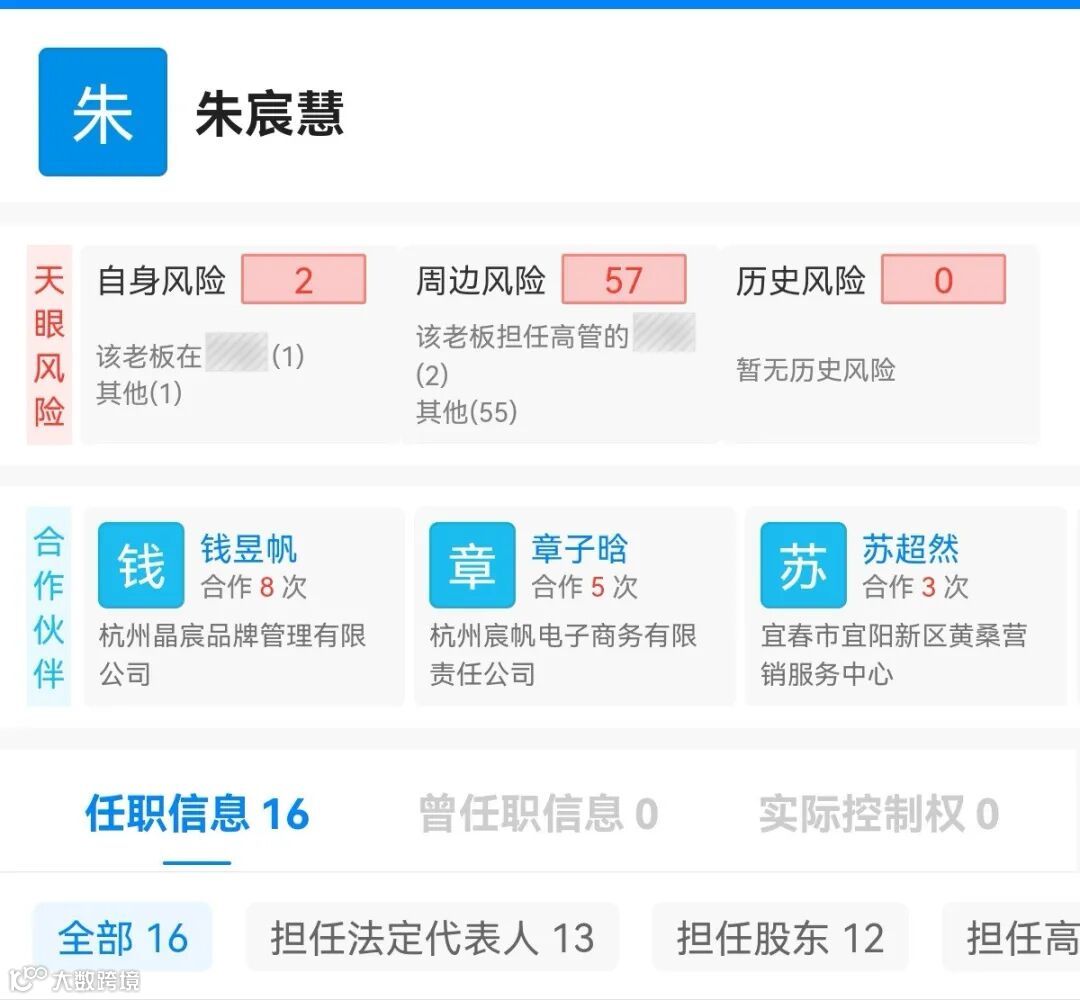 在7家存续企业中,除上述两家营销策划中心外,其还在宸帆娱乐传媒(杭州)有限公司担任法定代表人、执行董事兼总经理,并在衢州珊川电子商务有限公司、衢州大珊电子商务有限公司、南京川白影视传媒有限公司、舟山蕴予投资合伙企业(有限合伙)担任主要人员或持股。