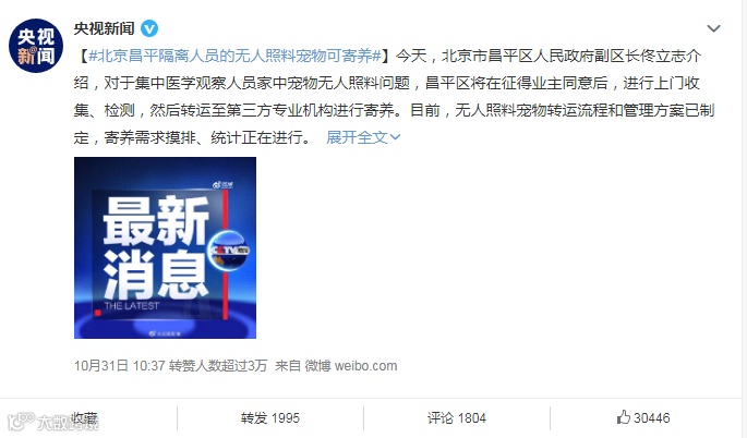 北京昌平隔离人员的无人照料宠物可寄养
