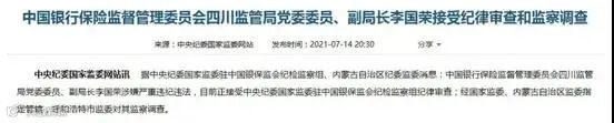 此前的7月14日,中纪委官网消息显示,银保监会四川监管局党委委员、副局长李国荣涉嫌严重违纪违法,目前正接受中央纪委国家监委驻中国银保监会纪检监察组纪律审查;经国家监委、内蒙古自治区监委指定管辖,呼和浩特市监委对其监察调查。