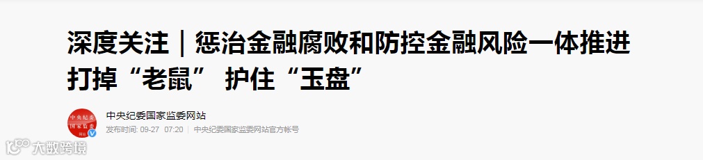 9月27日,中纪委官网刊登文章《深度关注 | 惩治金融腐败和防控金融风险一体推进,打掉“老鼠” 护住“玉盘”》。
