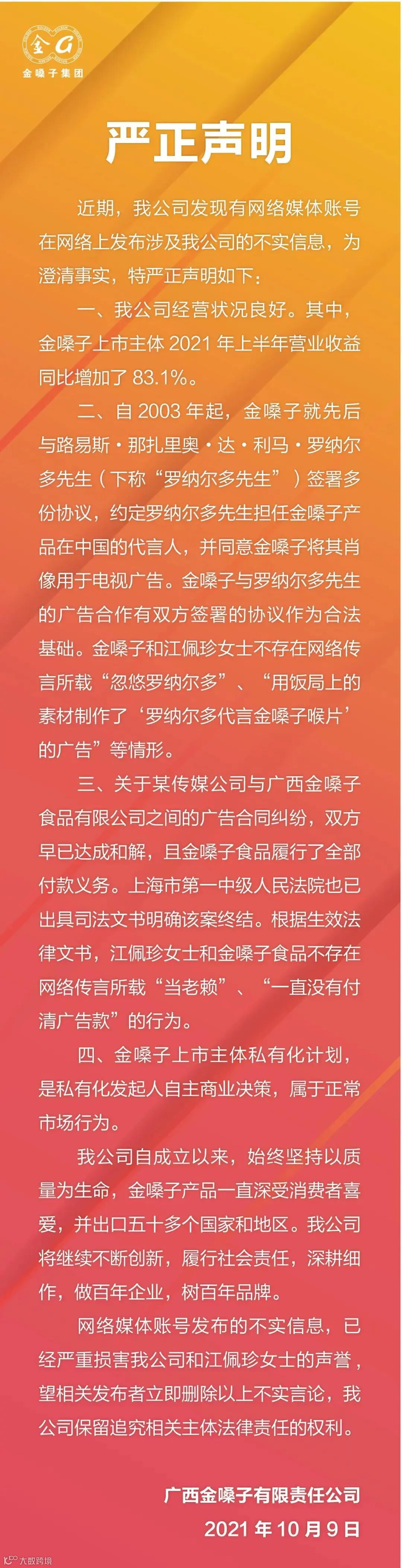 10月9日,广西金嗓子集团公众号