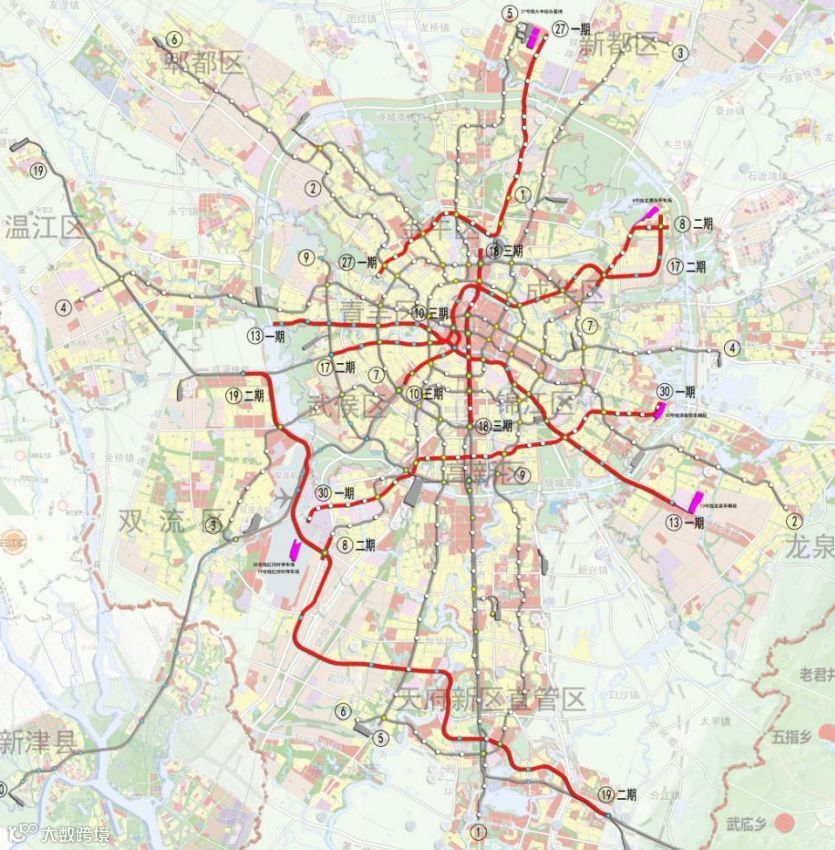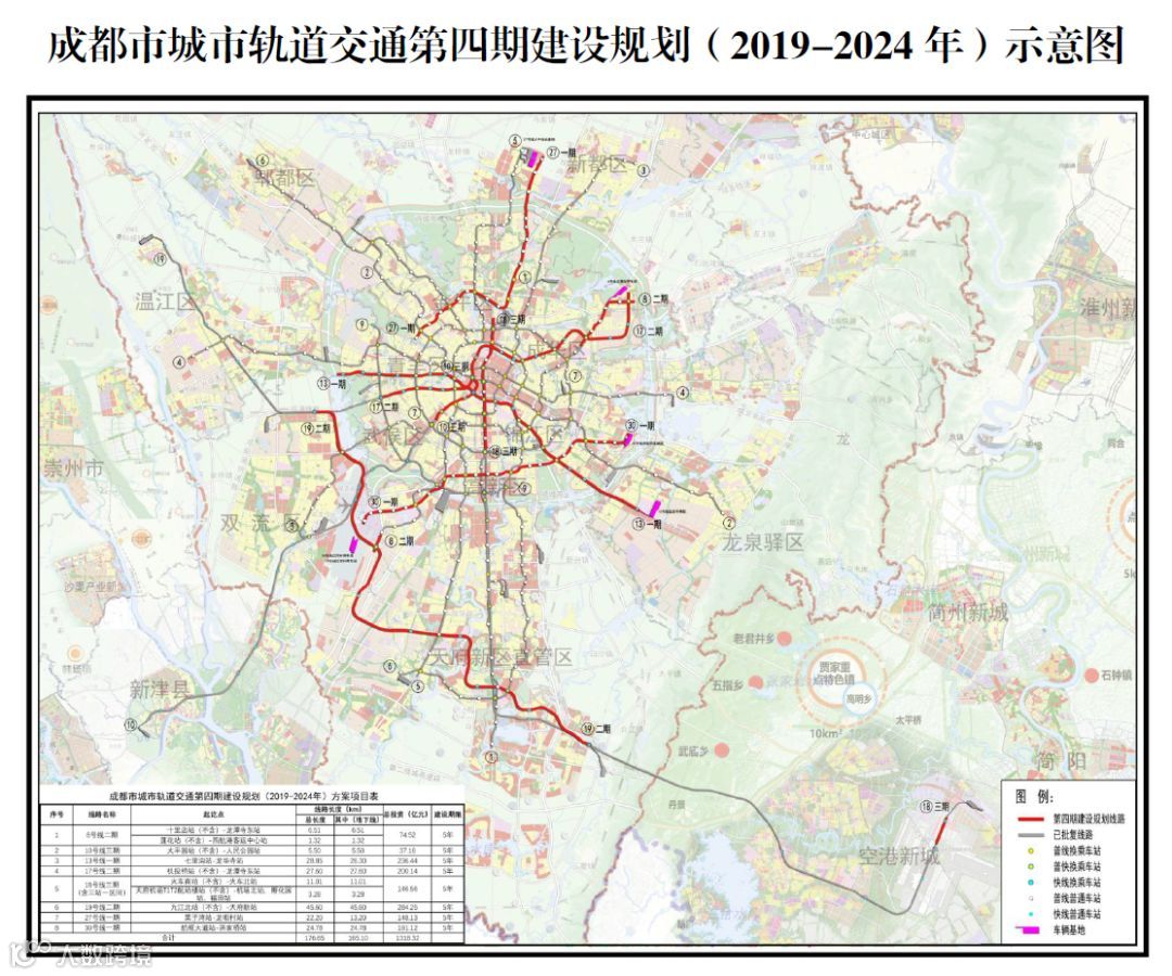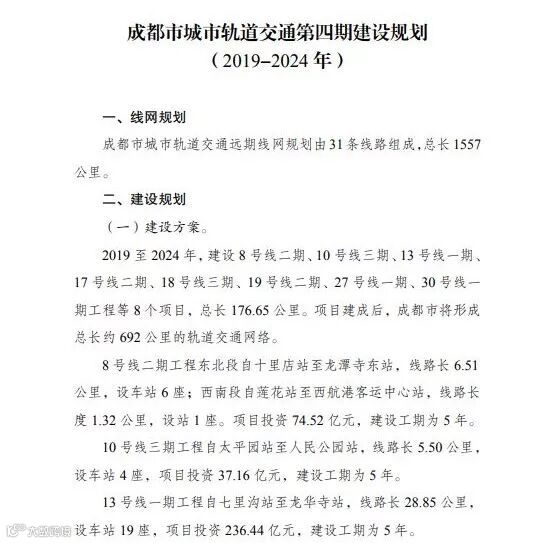 在《成都市城市轨道交通第四期建设规划(2019-2024年)》中,涉及8号线二期、10号线三期、13号线一期、17号线二期、18号线三期、19号线二期、27号线一期、30号线一期等8个项目,规划期为2019-2024年。
