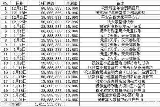 下图为雅堂金融的投资者统计2017-12-17日到2018-01-21日发的秒活动,诱骗投资人投秒1011111093元,新充值的钱款不知所踪。