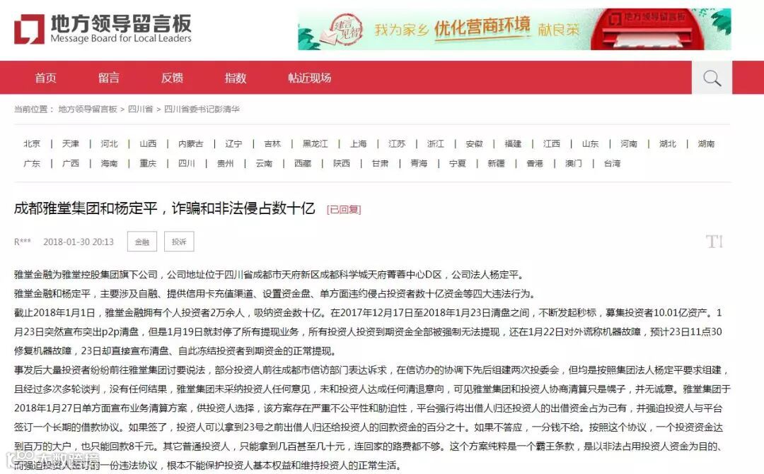 财富成都商业观察:近日,有受害者在网上爆料雅堂集团涉嫌诈骗,金额上百亿,受害人上万。以下内容为网友爆料:成都雅堂集团现位于成都市天府新区兴隆湖科学城D区A3栋,法定代表人杨定平,2016年9月被四川省有关方面作为重点招商引资企业引入天府新区。雅堂集团旗下核心板块就是雅堂金融,其前身叫搜搜贷,2012年杨定平接手后几经易名,2016年1月改名为雅堂金融,2016年9月,在成都重新注册为"成都雅堂金融服务股份有限公司",其声称是一家深耕产业链为核心的专业投资管理机构。雅堂金融在深圳期间就应其涉嫌自融,长期被业内质疑,并被深圳有关方面列为重点监控平台。