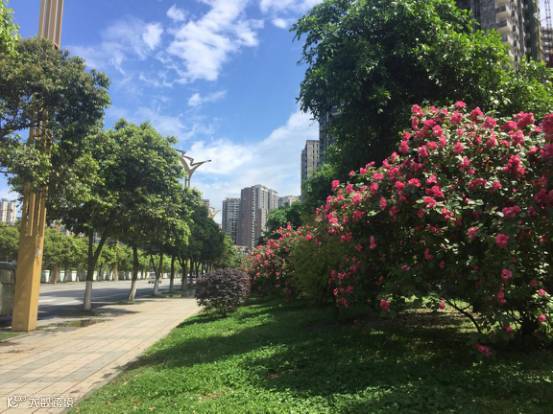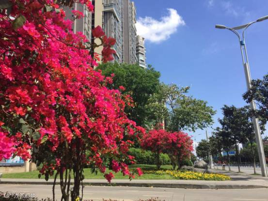 “骑士大道就像鲜花大道一样,道路两旁以蔷薇为主题,搭配三角梅、樱花、紫薇等花树,一时间,你似乎是来到了一个色彩斑斓的花园。”
