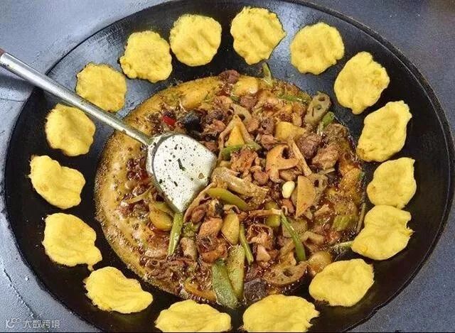 大火炒制,鸡肉香辣诱人,锅边馍软香甜糯。
