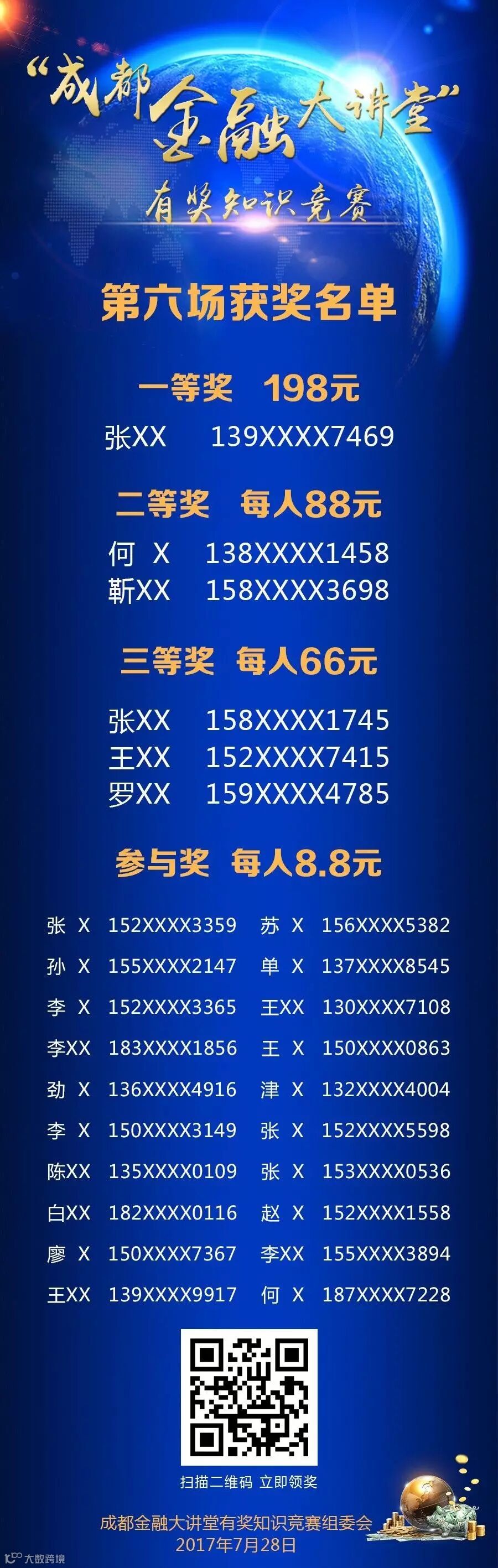 此外,“成都金融大讲堂”线下有奖知识竞赛将在今年9月举行。线下有奖知识竞赛,设一等奖1个,获iPhone7(黑色128G)一部;二等奖2个,分别获iPad mini4(64G)一台;三等奖3个,分别获kindle一台、参与奖50个分别获京东卡一张(面值50元)。线下活动采取现场答题,现场发奖。