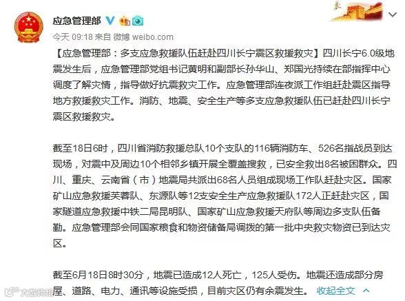 6月18日零时50分,记者从四川省应急管理厅获悉,该厅已派出前方工作组,由应急管理厅副厅长吴金炉带队赶赴震中。