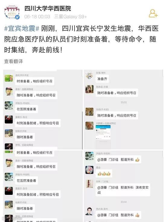 @四川大学华西医院 在18日0点3分发布微博:“刚刚,四川宜宾长宁发生地震,华西医院应急医疗队的队员们时刻准备着,等待命令,随时集结,奔赴前线! ”