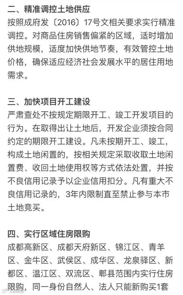 “通知”“要求成都高新区、成都天府新区、锦江区、青羊区、金牛区、武侯区、成华区、龙泉驿区、新都区、温江区、双流区、郫县范围内实行住房限购,同一身份自然人、法人只能新购买1套商品住房(法人单位经审查确属用自有资金购买商品住房且用于职工自住的除外)。严格执行住房限购地区信贷政策,购买二套房商业性个人住房贷款首付款比例不低于40%。”