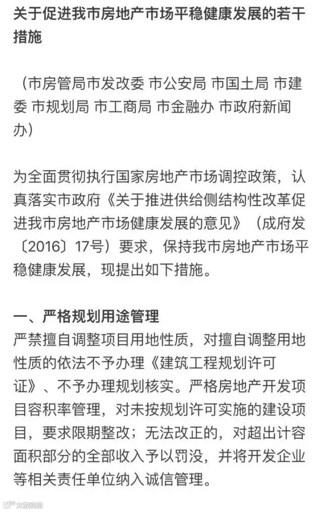 财富成都政策速递:10月1日,成都市人民政府门户网站正式发布《关于促进我市房地产市场平稳健康发展若干措施的通知》(简称“通知”)。该“通知”表示,为全面贯彻执行国家房地产市场调控政策,保持成都市房地产市场平稳健康发展,从规划、土地、建设、限购、销售、监管以及保障等11个方面提出具体措施,并且于即日起施行。