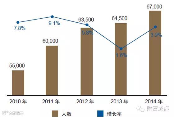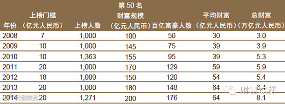 而纵观从2008年到2014年的《胡润百富榜》榜单数据发现,富豪上榜人数始终保持在1000位以上;上榜门槛从2008年的7亿元人民币上升到现在的20亿元人民币;平均财富也由30亿元人民币上升到64亿元人民币;百亿富豪人数由50人扩大到176人,显示出中国超高净值人群的财富规模和人群数量都在持续提升。