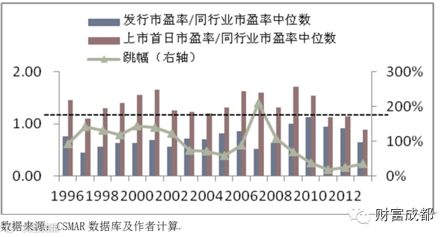 下图是1996-2013年间中国新股市盈率与同业已上市公司市盈率的对比。从第一个比值到第二个比值的涨幅大约就是上市首日股票收益率。
