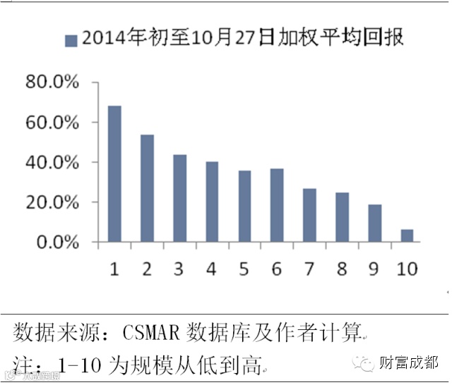 今年年初所有可交易的股票的按照总市值排序(下图),从小到大分为10组,年初买入并持有至今,市值最小的十分之一的股票组合今年的累积回报已高达近70%。这一收益几乎冠绝公募基金,在阳光私募中也可排入前十。