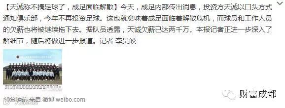 成渝招商助推中心 财富成都商业快报:今天,成足内部传出消息,投资方天诚以口头方式通知俱乐部,今年不再投资足球。这也就意味着成足面临着解散危机,而球员和工作人员的欠薪也将被继续拖下去。据队员透露,天诚欠薪已达2000万。