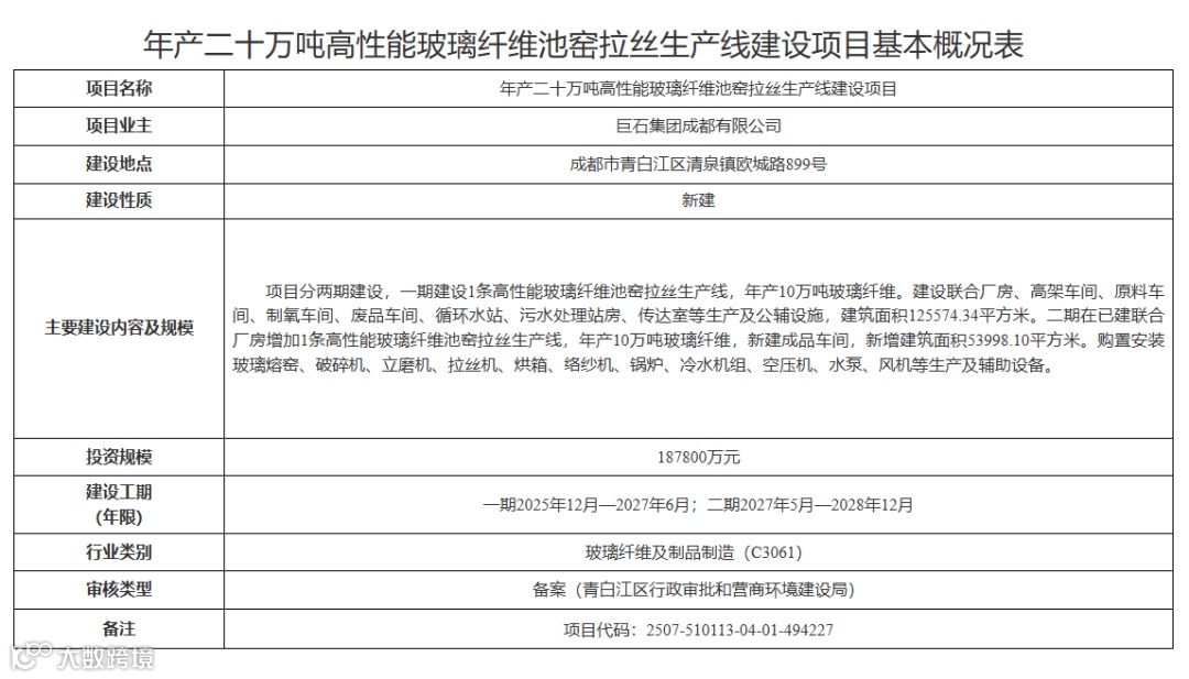 近日,巨石集团成都有限公司年产二十万吨高性能玻璃纤维池窑拉丝生产线建设项目迎来新进展。截至2026年2月,项目多项招标工作有序推进,桩基工程、给排水管网埋地安装等已完成招标,进入施工准备阶段,幕墙设计、桩基检测服务仍在招标中。