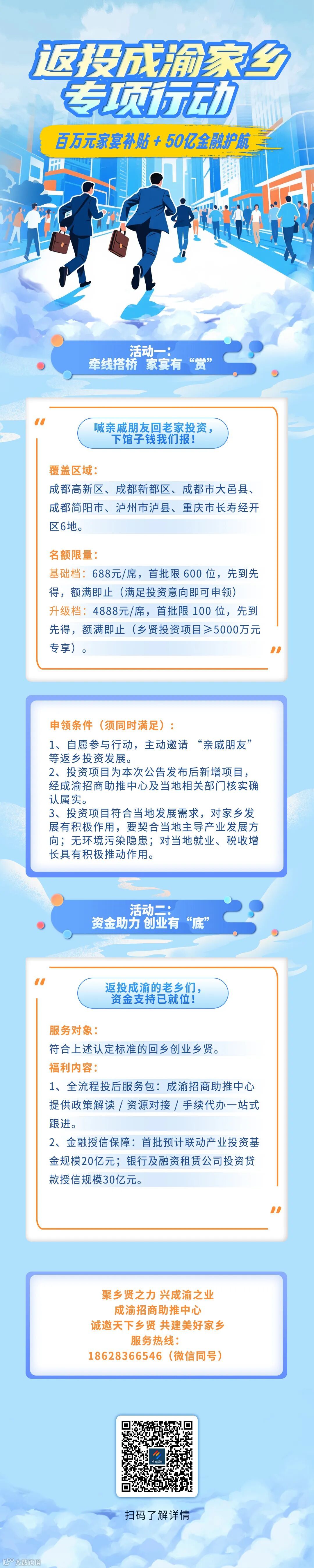 2025年“返投成渝家乡”专项行动应运而生,财联社科创四川、成渝招商助推中心联动川渝地区地方政府、产业园区、投资基金、银行等生态合作伙伴,面向全球川渝籍老乡及优质企业推出,首批联动地方政府成都高新区、成都新都区、成都市大邑县、成都简阳市、泸州市泸县、重庆长寿经开区6地,备了50亿资金、100万家宴券,就盼着老乡们带项目回家。行动才启动10天,12个项目已经入库,首批家宴券也发出去了——这事,靠谱!