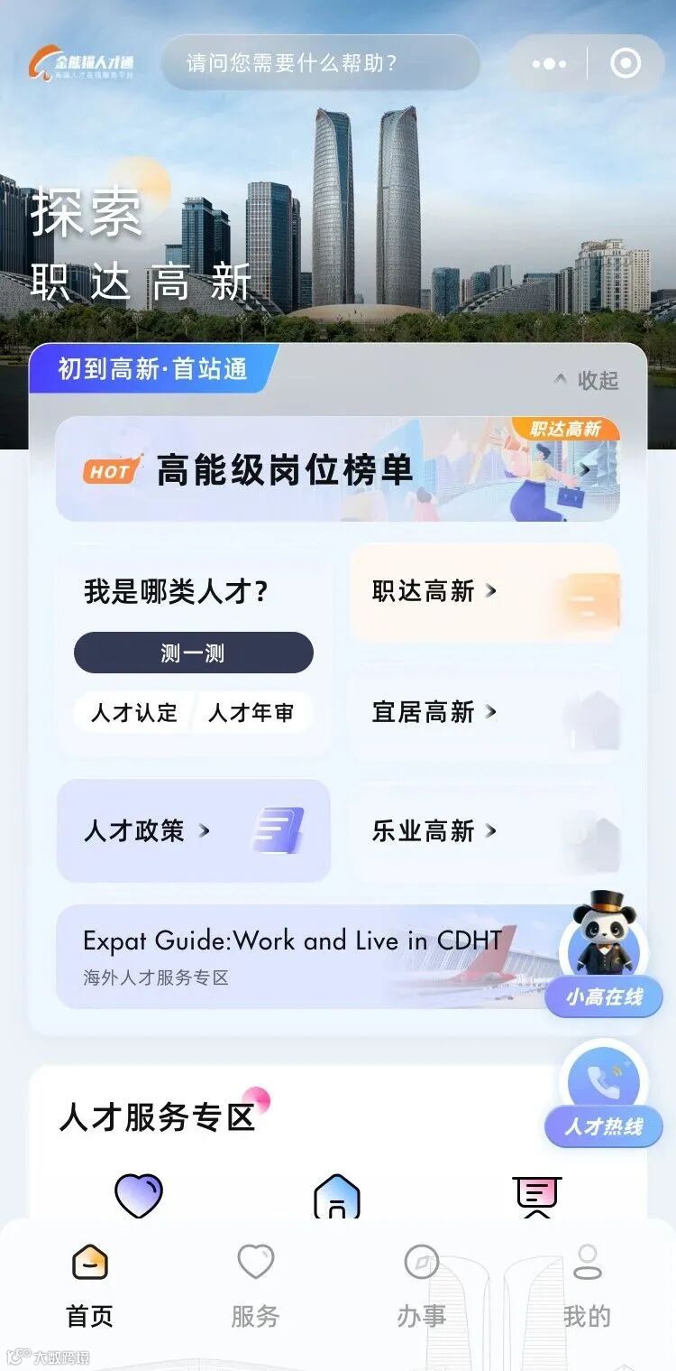 打造“金熊猫人才通”人才在线服务平台,围绕人才关心的教育、医疗、住房等九大服务,形成政策“一键匹配”、事项“一网通办”、诉求“一站反馈”和资源“一体链接”四大功能,搭建起综合性人才信息化服务支撑平台,组建人才服务专员队伍,共同构建“线上+线下”全链条人才服务体系,为成都高新区人才提供全方位、全时段的优质服务。